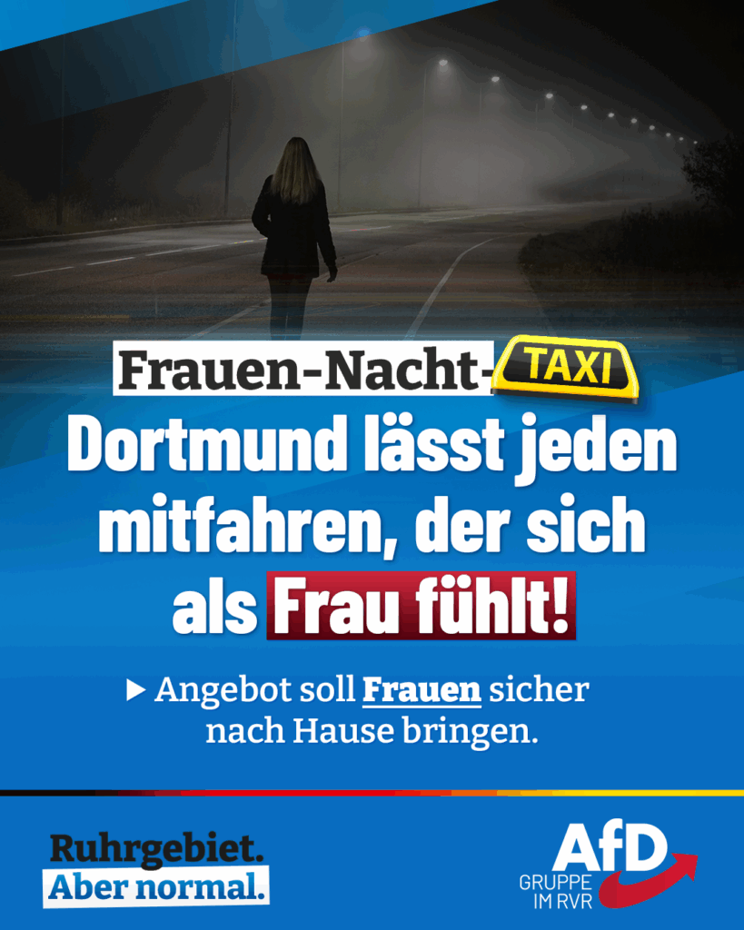 Kommunale „Frauen-Nacht-Taxis“ sollen weibliche Fahrgäste nachts sicher von der Endhaltestelle bis zur heimischen Haustür bringen. Es ist schlimm genug, dass es solche Angebote angesichts der importierten Gewaltkriminalität geben muss – doch berechtigt einzusteigen sind in Dortmund auch noch „alle Personen, die sich als Frau definieren, als Frau definiert werden und/oder sich als solche sichtbar gemacht sehen“!