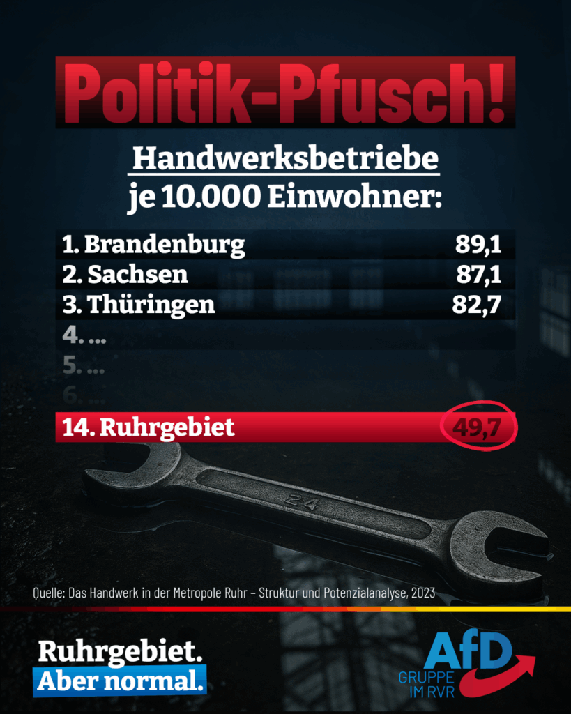 Fachkräftemangel auf dem Land? Bei uns ist es noch schlimmer! Auf der Rangliste der Handwerksbetriebe pro 10.000 Einwohner liegt das Ruhrgebiet als größter Ballungsraum Deutschlands im Schlussfeld. Trotz seiner sehr niedrigen Bevölkerungsdichte belegt Brandenburg hingegen den ersten Platz. Laut Struktur- und Potenzialanalyse des Regionalverbands Ruhr kommen auf 10.000 Brandenburger fast 90 Betriebe. Bei uns sind …